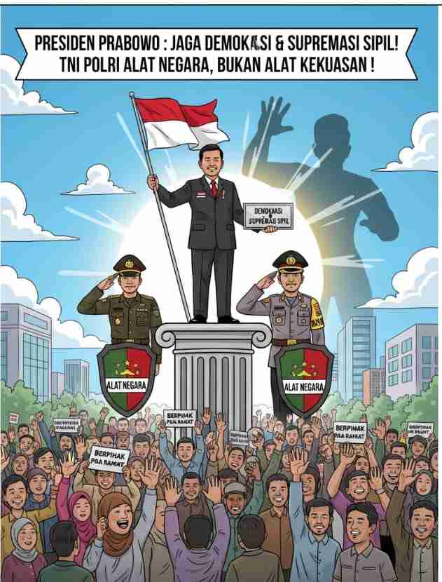 Presiden Prabowo Subianto—seorang sipil yang memegang tampuk kekuasaan tertinggi—dituntut untuk konsisten menjaga Demokrasi dan Supremasi Sipil. Beliau harus teguh berpihak pada Rakyat serta menempatkan TNI dan Polri sebagai alat negara yang profesional dan netral, bukan alat kekuasaan politiknya.